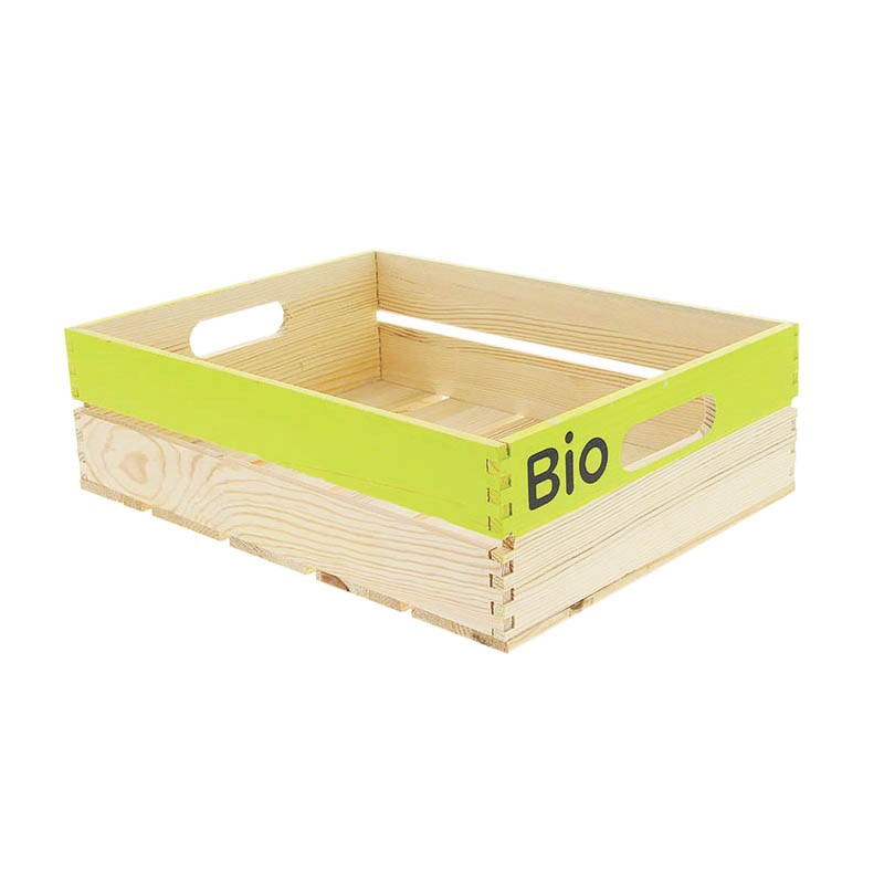 Cagette en pin de couleur verte avec marquage BIO. Dimensions 40x30x6cm.