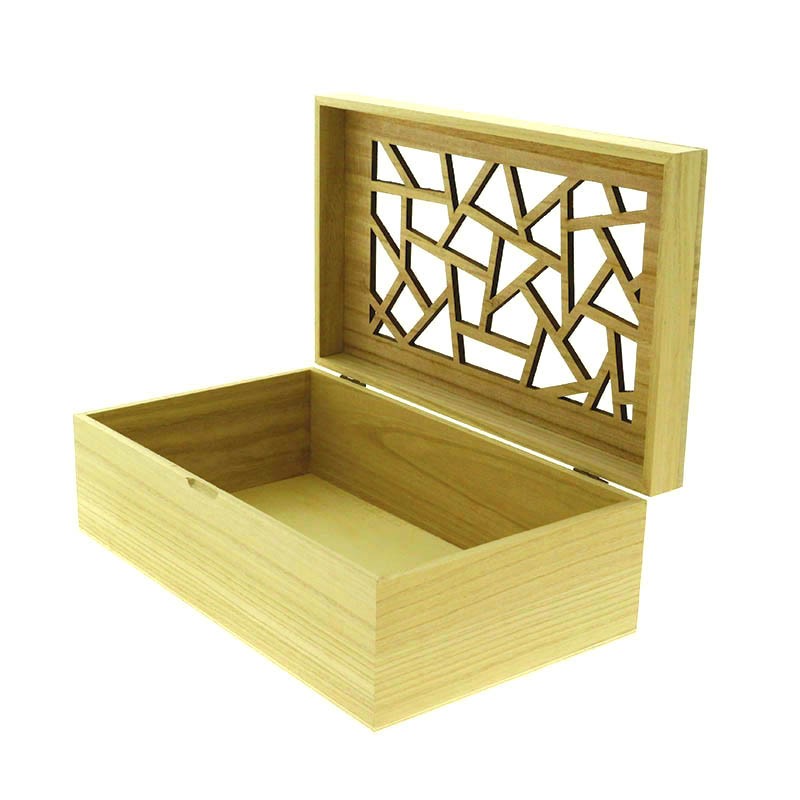Corbeille bois rectangle Laser petit modèle, 28x19x6.6 cm.Bois naturel.Découpe au laser de formes géométriques sur la face avant.Certifiée contact alimentaire.