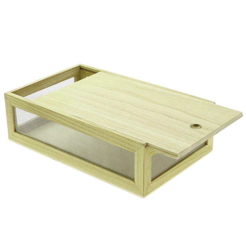 Boite rectangle en bois avec grillage sur les cotés. Couvercle coulissantDestinataire :