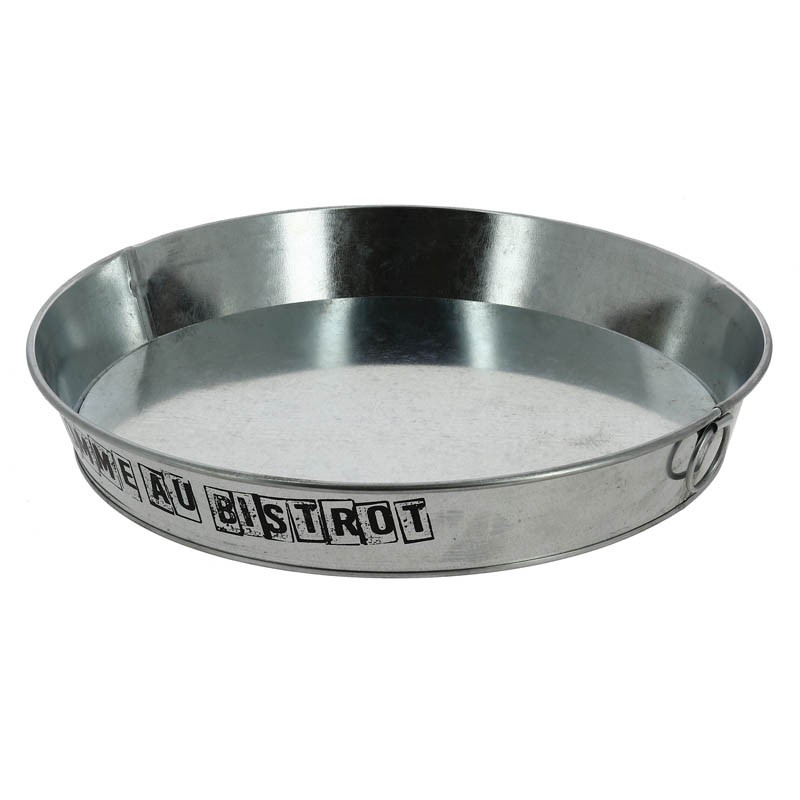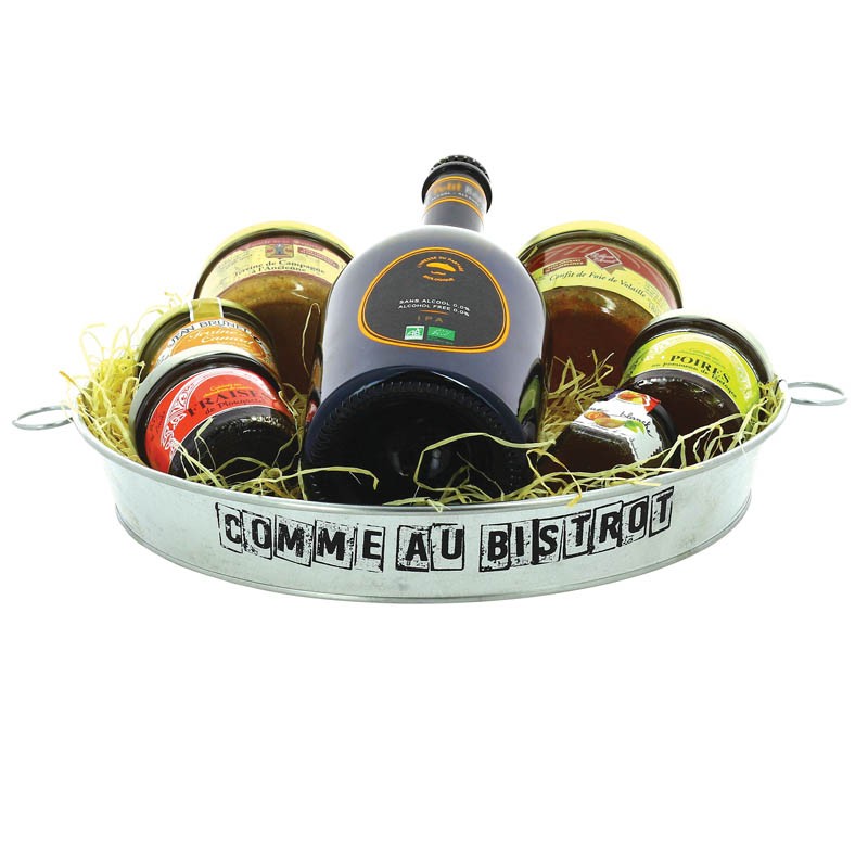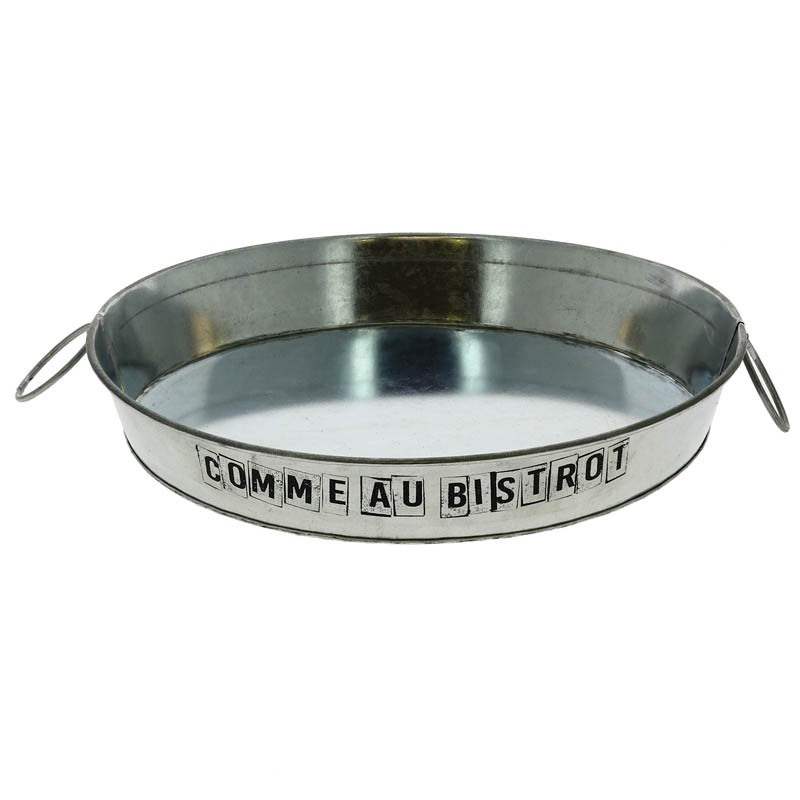 Plateau rond Ø32x5 cm en zinc, 2 anses rabattables, inscription noire Comme au Bistrot pour la composition de coffret cadeauDestinataire :