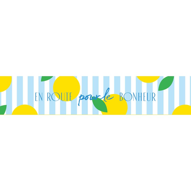 Corbeille rectangle en carton Bonheur idéal pour la confection de colis cadeau de produits regionaux. Décor citron avec mention en route pour le bonheur. Exemple de capacité de contenance : 2 bouteilles 37.5cl + 2 terrines 90gr + 1 sachet de biscuits Carton certifié FSC.