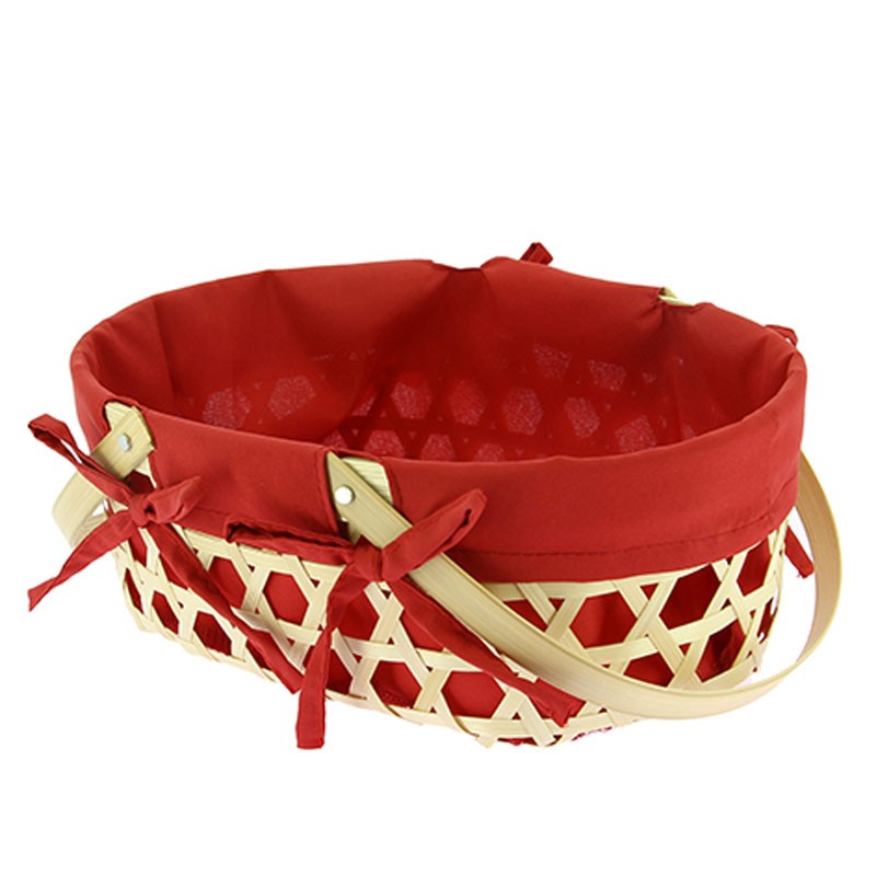 Cette jolie corbeille en bambou ajouré avec anses et tissu rouge est parfaite pour offrir un cadeau de produits regionnaux. Son design naturel et sa couleur vive en font un emballage original pour toutes les occasions.