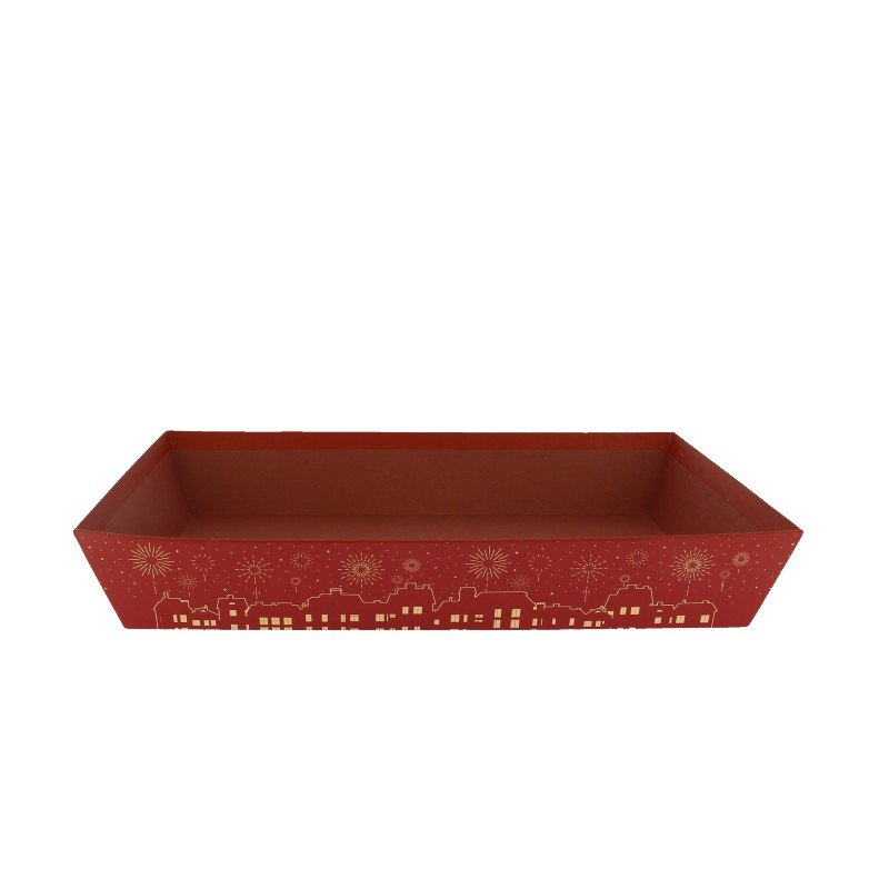 Fabriquée en carton de haute qualité, elle se distingue par sa couleur rouge profond festive et sa finition mate soignée. Le décor est rehaussé d'une dorure à chaud lumineuse, créant un contraste sophistiqué qui garantit l'impact visuel et positionne le colis dans la gamme supérieure.