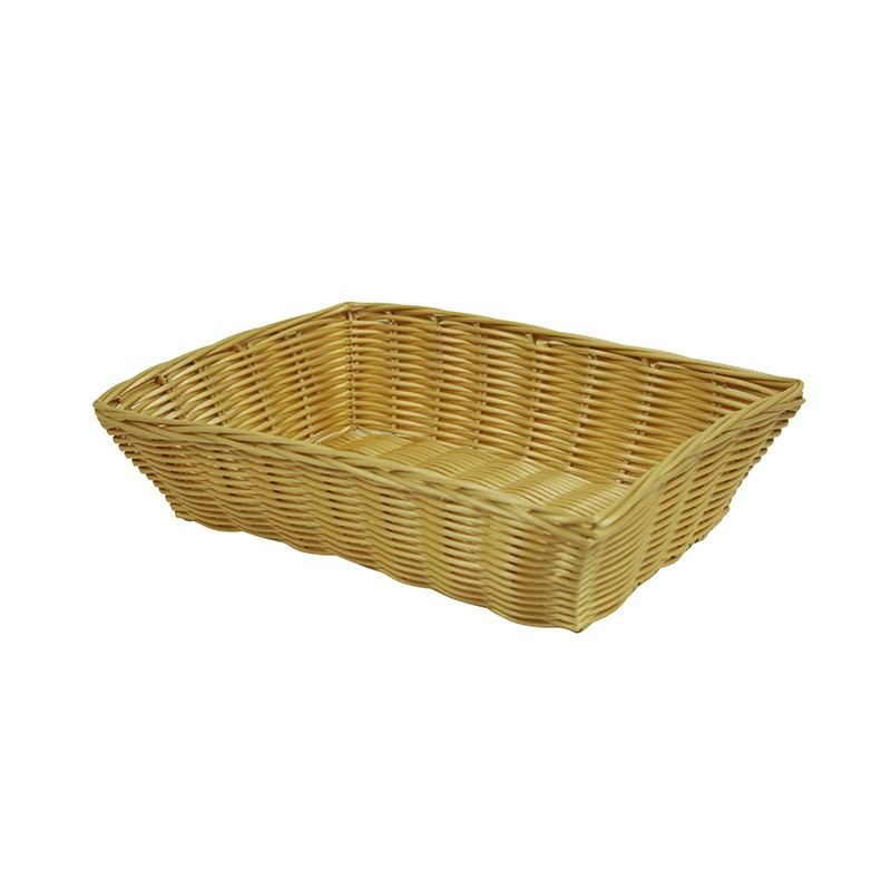 Corbeille rectangle empilable en plastique tressé imitation osier 28x20x6 cm, coloris miel certifiée contact alimentaire pour la présentation de vos produits et la composition de paniers garnisDestinataire :