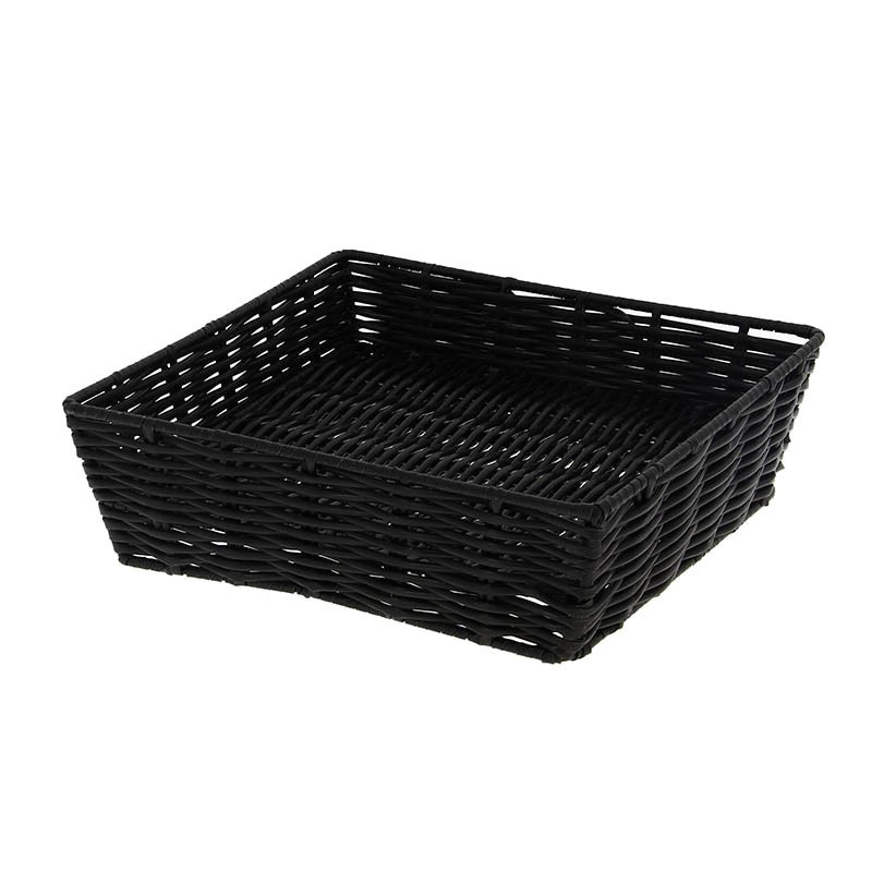 Présentoir rectangle en tressage plastique noir avec armature époxy. Certification SGS alimentaire. Profondeur 4 cm, dimensions : 50x25x7,5cm.