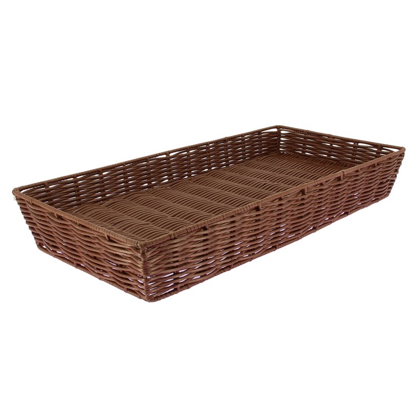 Présentoir en tressage plastique marron avec armature époxy. Certification SGS alimentaire. Profondeur 4 cm, dimensions 50x25x7cm.Destinataire :