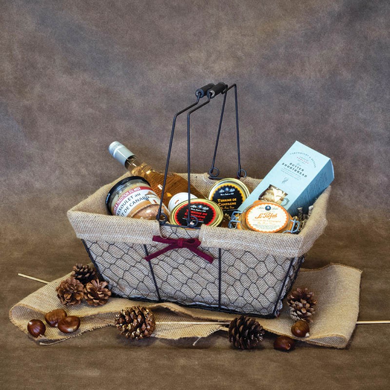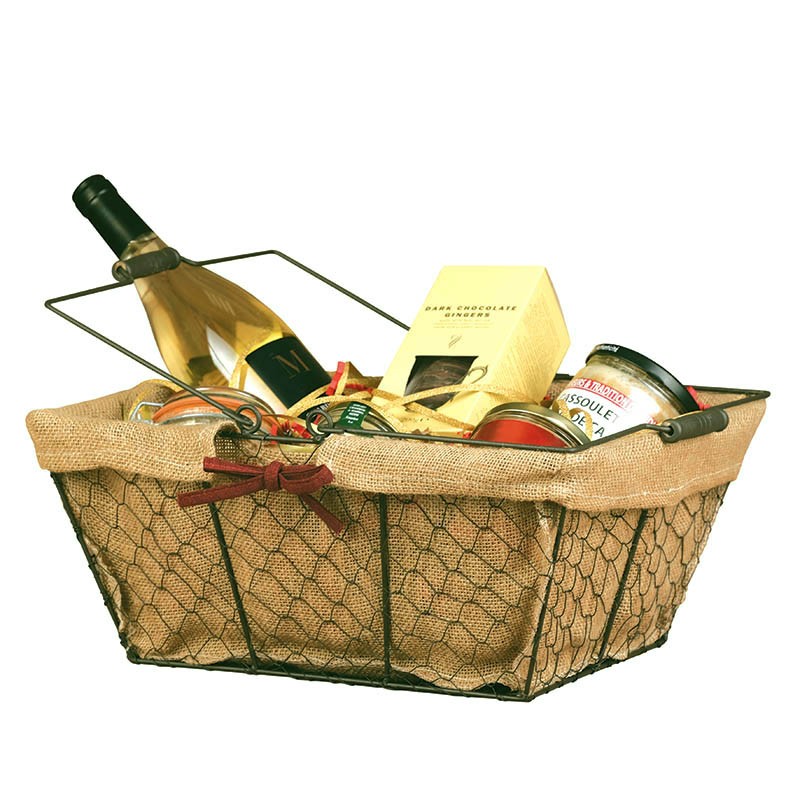 Panier rectangle 38x28x16 cm en métal grillagé noir, 2 anses rabattables avec poignée en bois et doublé toile de jute amovible maintenue par un nœud en coton bordeaux pour la composition de paniers garnis et la présentation de vos produitsDestinataire :