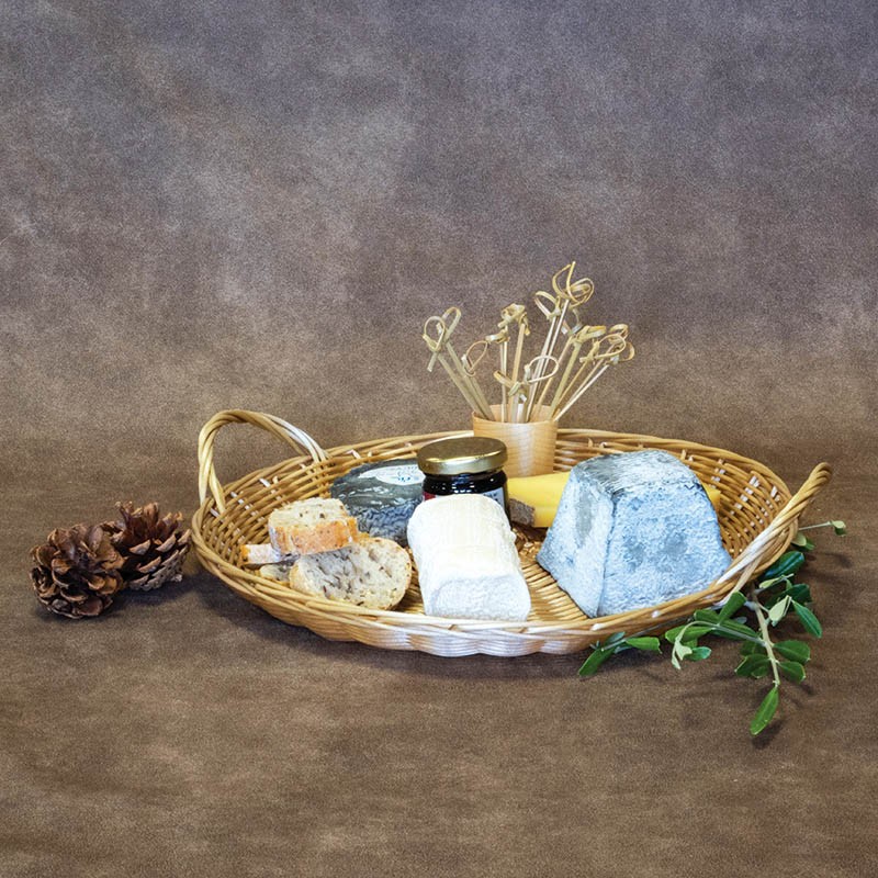 Plateau tressé rond diam 25x2 cm en éclisse d'osier et bois certifié contact alimentaire pour la présentation de vos produits (charcuteries, fromages, fruits)