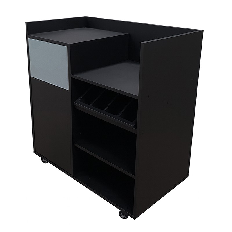 Optimisez l'organisation de votre salle de restaurant ou de votre espace buffet avec cette desserte sur roulettes. Conçue en aggloméré, elle propose un espace de rangement pour couverts, un bac poubelle intégré et des étagères. Idéale pour les professionnels de la restauration, elle allie praticité et mobilité.