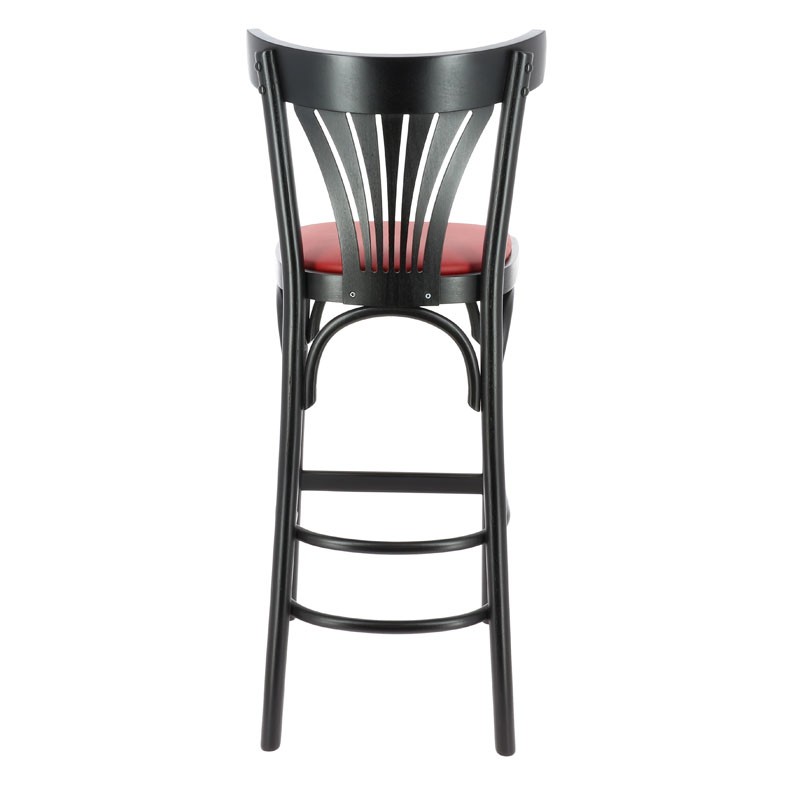 Chaise de bar intérieur New Orleans en hêtre massif couleur noir. Assise en simili cuir rouge. Dimensions 109x79x42 cm, 6 kg.Destinataire :
