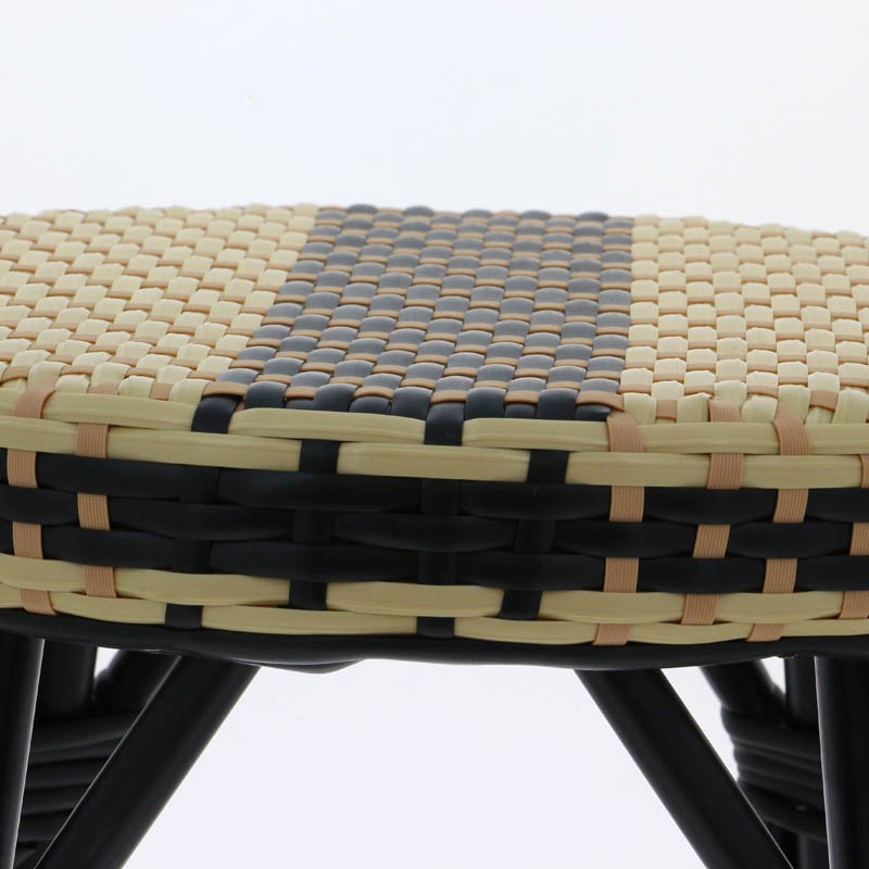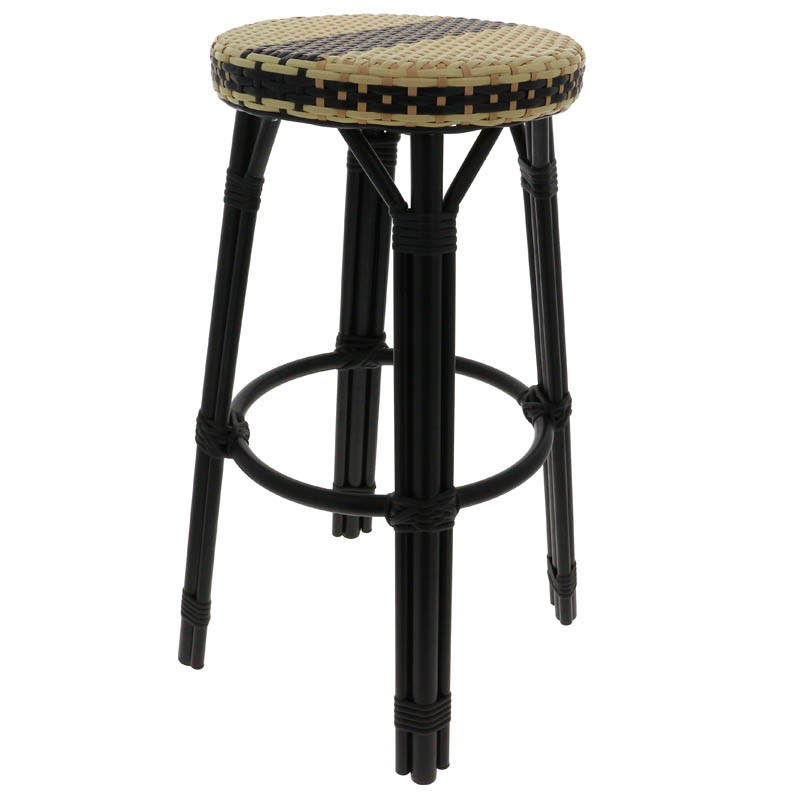 Ce tabouret de bar exterieure possède une structure en aluminim noir. L'assise et le dossier sont en polypropylène tressé noir, beige et ivoire.Destinataire :