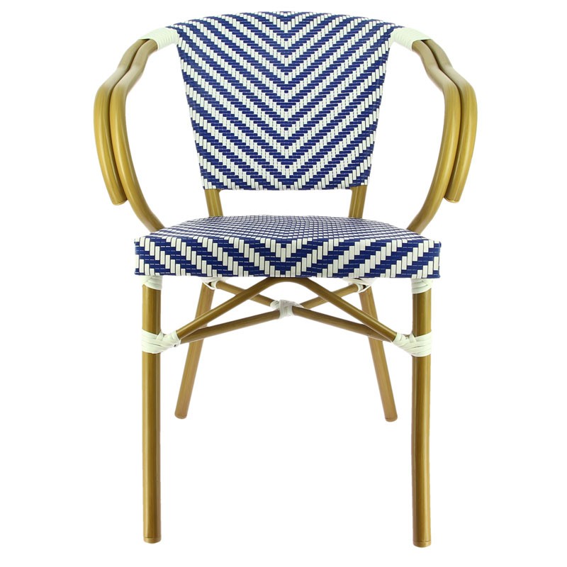 Chaise d'extérieur de restaurant avec structure en aluminium imitation teck et tressage en polypropylène bleu et blanc. Esthétique et robuste, parfaite pour les terrasses grâce à sa légèreté et sa résistance aux intempéries.