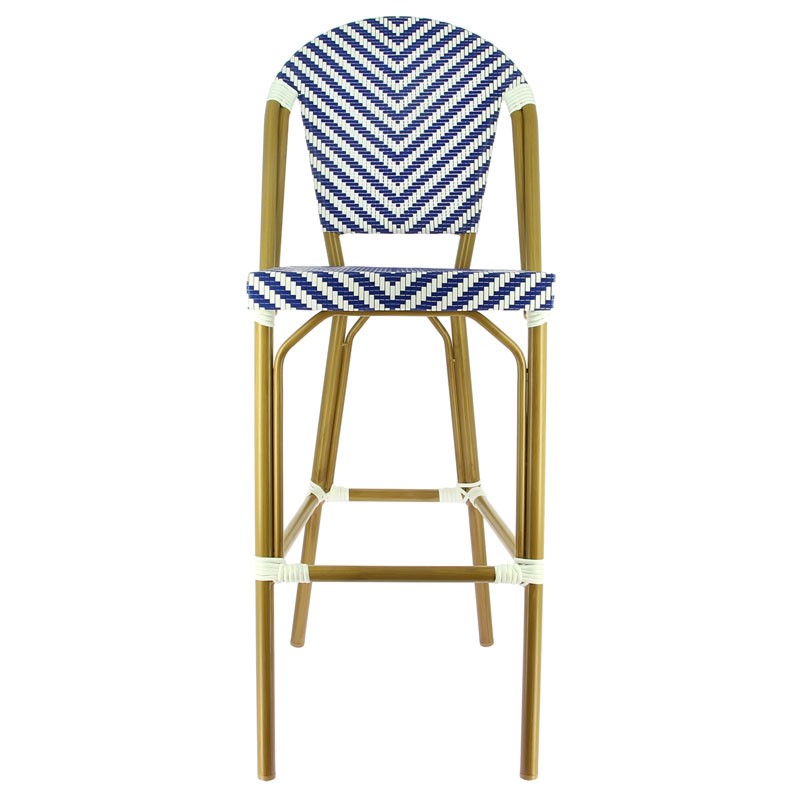 Ce tabouret d'extérieur allie une structure en aluminium imitation teck et un tressage en polypropylène bleu et blanc. Résistant et élégant, il est idéal pour les terrasses de bars et restaurants, offrant confort et style durable.