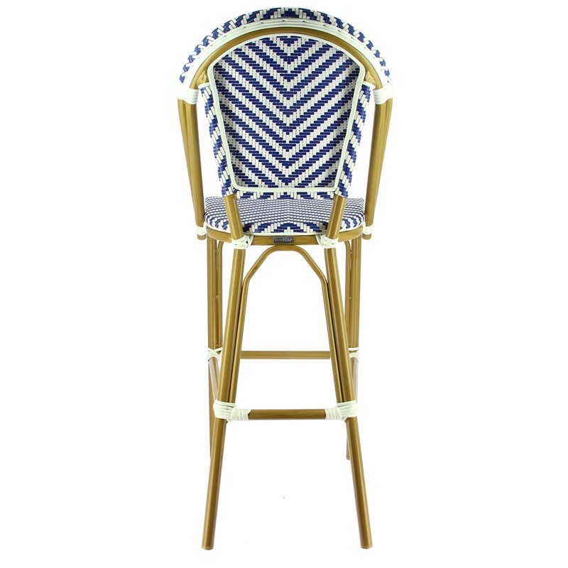Chaise haute de restaurant extérieure en aluminium imitation teck avec tressage en polypropylène bleu et blanc alliant esthétique et durabilité. Idéale pour les terrasses grâce à sa légèreté et sa résistance.Destinataire :